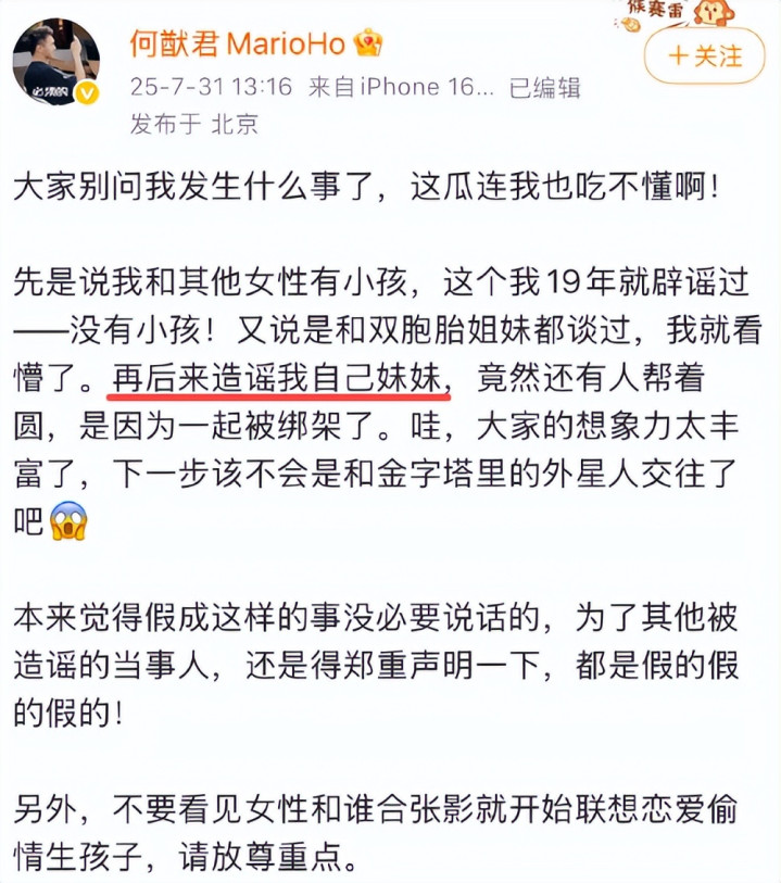 而关于也曾传得离谱的何猷君和妹妹的恋情瓜,何猷君在2025年就发长文辟谣过。