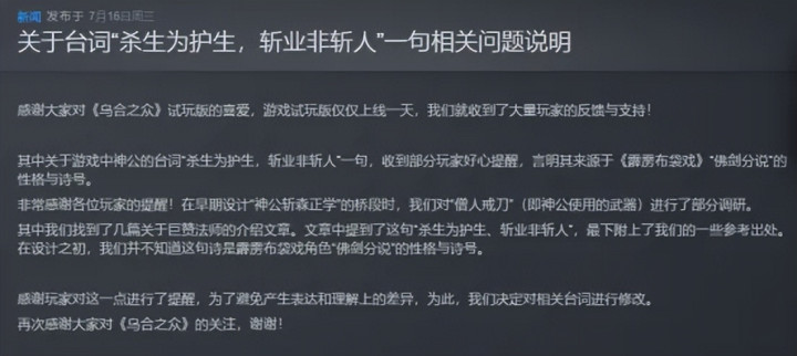 联系这点,制作组在7月16号发布的公告里作念出了评释,他们是在创作调研时从著作里找到了这个句子,一启动并不知谈这句话是《轰隆布袋戏》里的内容,况兼在公揭发出时,他们就照旧删掉了这句台词。