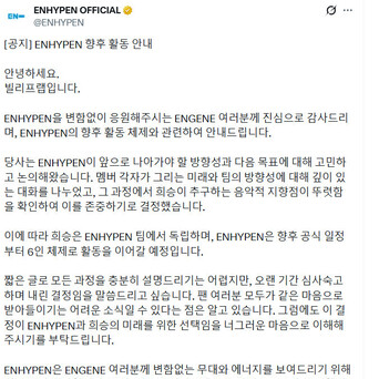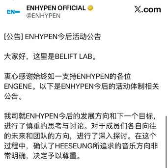 #李羲承退队##ENHYPEN将六东谈主组步履# 10日,ENHYPEN发布公告通告李羲承退团幽静步履,组合以后将以六东谈主体制伸开步履。“天然用这简约的笔墨开yun体育网,无法对通盘这个词经由给予充分阐扬,但但愿环球简略了解开yun体育网,这是经长工夫的三念念此后行后作念出的决定。”#李羲承 ENHYPEN#
